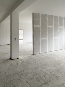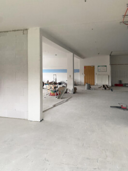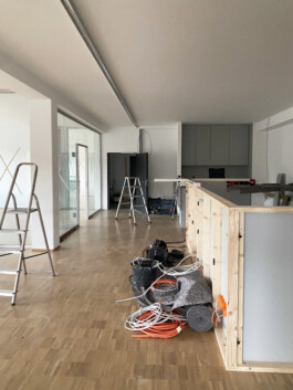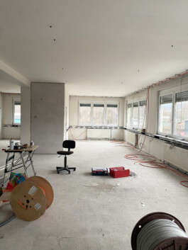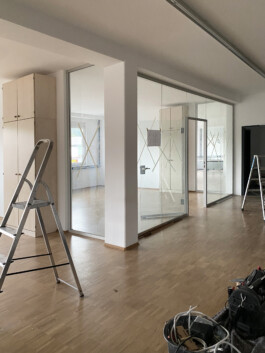 An industrial building from the 1980s, consisting of prefabricated concrete slabs, is to be converted into a company's new headquarters. An open-plan office with workspaces, conference rooms, social rooms and a communal kitchen is being built on around 800 square meters, which extends over three floors. Glass partition walls create visual relationships between the work rooms, which extend over the entire floor. This makes the office look spacious and at the same time offers acoustic advantages.